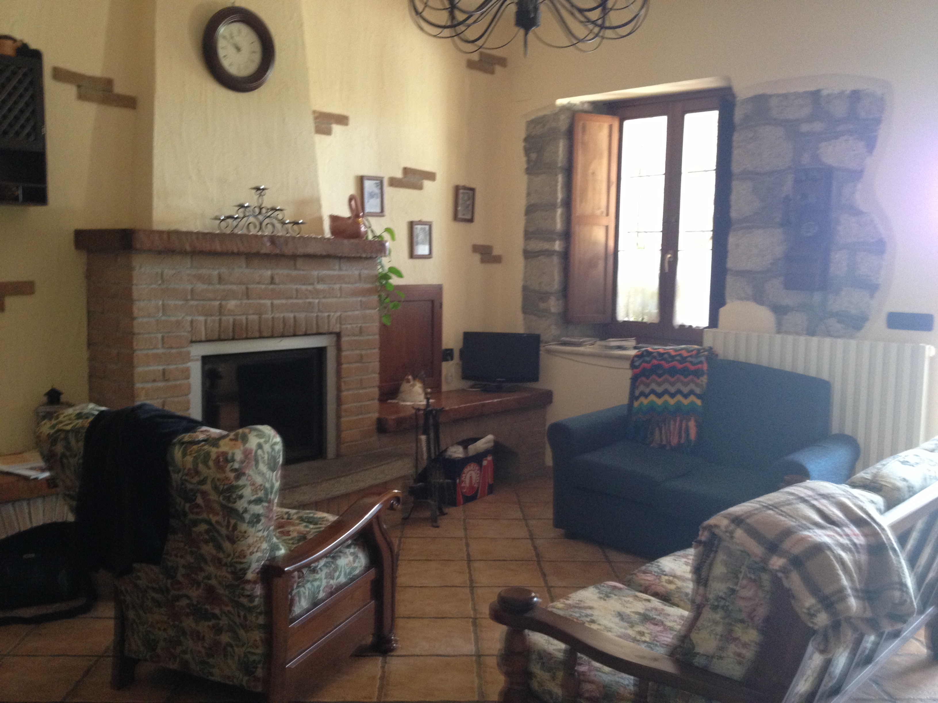 As you walk inside you are in the sitting room – note the fireplace. Sitting Room That not only provides ambiance but is also the source for the heat in the whole house.  Many folks here have heating systems that are based on hot water being heated by the wood burning fire place or pellet stove.  You have to make sure that you have a fire going if you want to take the chill off the house.  I  spent the first night here  whining about how cold I was – all those summer clothes I packed don’t keep me warm in the mountain.  All the floors are terracotta that sends the cold right up my legs.
