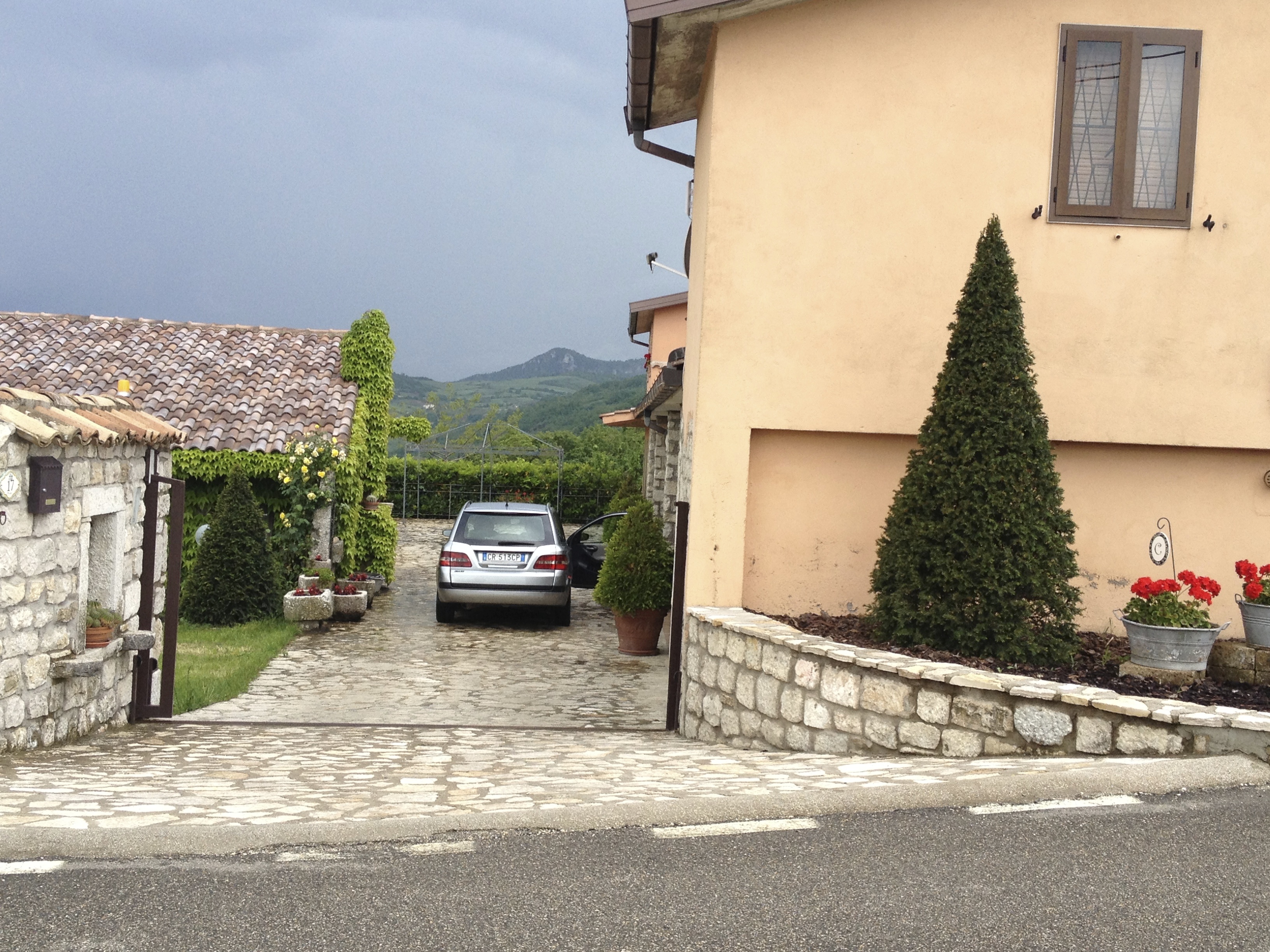 My cousin Carmella is amazing.  When I called and told her we had decided to jump into the fire and try living in Pontelandolfo, she scurried about looking for an apartment for us.  I wanted three bedrooms in the hope that I could nudge the other USA members of our extended family to hop over and visit too.  That plus my two bathroom requirement made the search more of a challenge. Carmella knows everyone in Pontelandolfo and kept asking around until she discovered the gem of all gems.  We are living in half of a completely updated and restored stone dwelling.  Three bedrooms, three bathrooms, the formal kitchen and the working kitchen, dining room and well – just look at the pictures!Driveway
