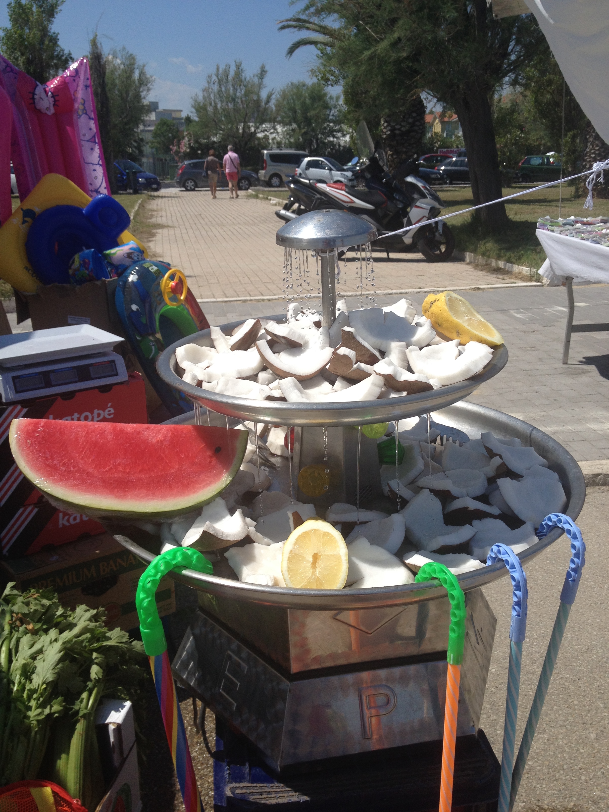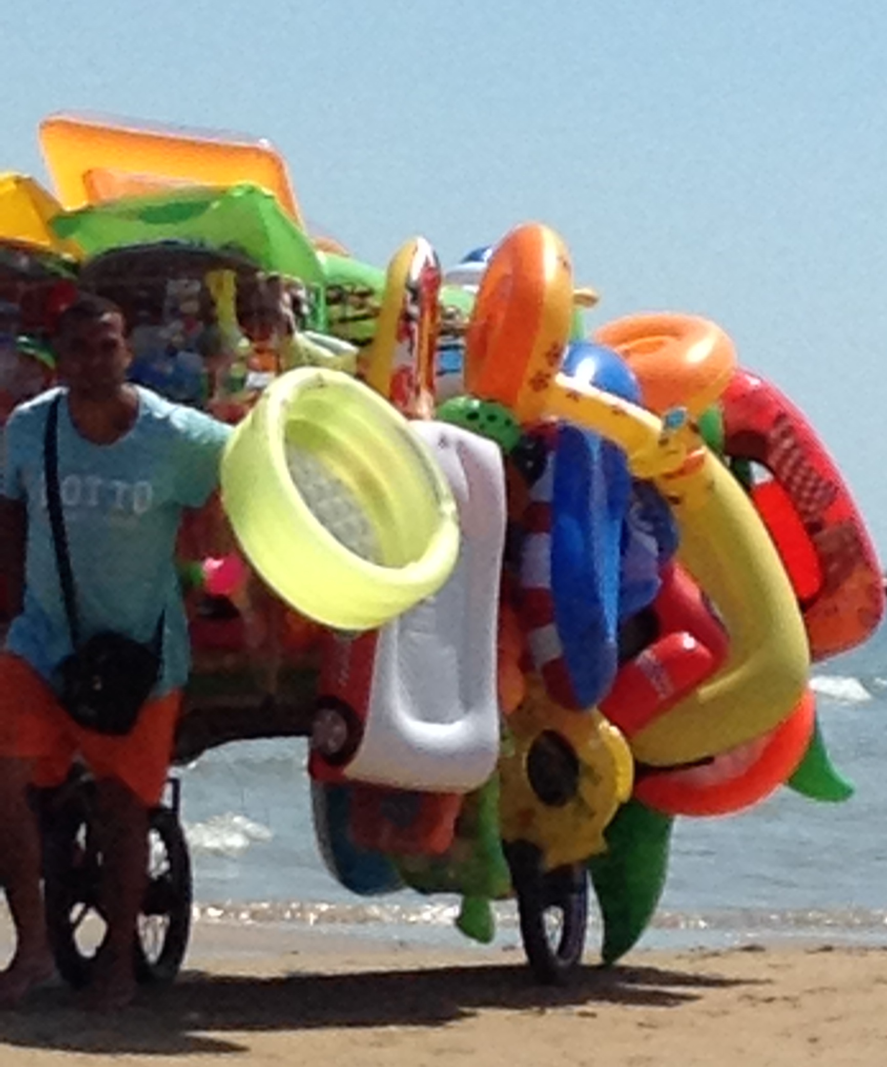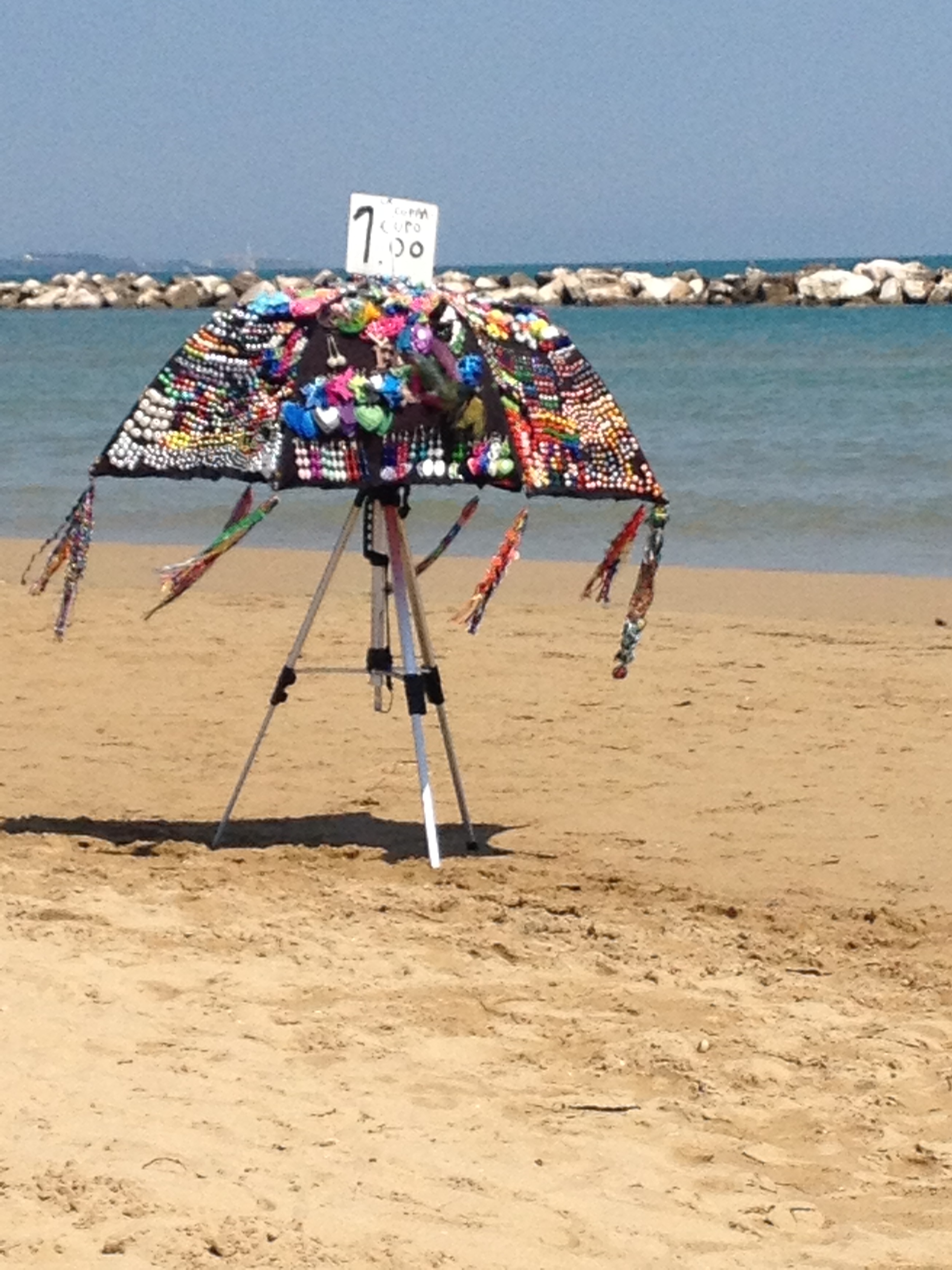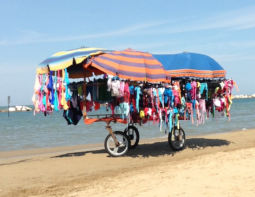 For those of us who were just too lazy to get off our lounge chairs and walk to the market – the market came to us. Every day vendors of all types strolled the beach. Looking for gold – well maybe it was gold – here comes the guy with the velvet cases. Want your hair braided? How about a henna faux tattoo? Coconut milk to slurp – here comes the rolling cart. Need beach toys – no worry – just raise your arm and the vendor delivers. Rats – you spilled goop on your bikini – for €10 you can get a new one. I loved the action between the vendors and the beach goers and I perfected my ,”no, grazie.”