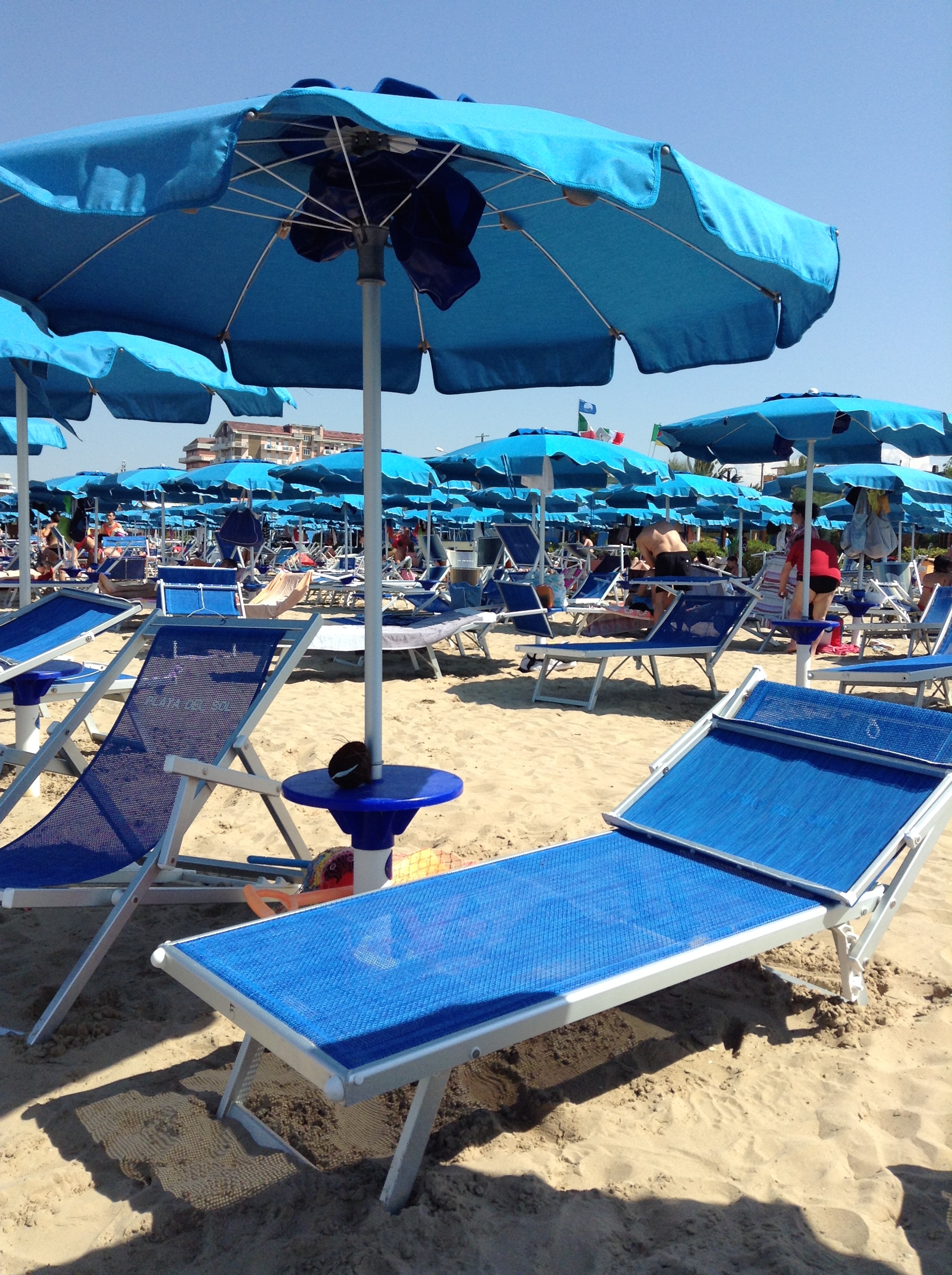Jack and I rented an apartment for a week in a cute seaside town. The Adriatic Sea is just over the mountain from Pontelandolfo. It took us an hour and a half to get to San Salvo. That’s a hop, skip and a jump to a fabulous beach resort. Having lived in Asbury Park and Jack’s growing up in Sea Girt, we are pretty familiar with life at the beach. Well, life at the beach here is a wee bit different than a visit to the Jersey shore. First of all, I wasn’t the pack mule carrying an umbrella, chair, cooler, towel, hat, book, water bottle etc. I was a lady of leisure with my own little spot on the water line.
