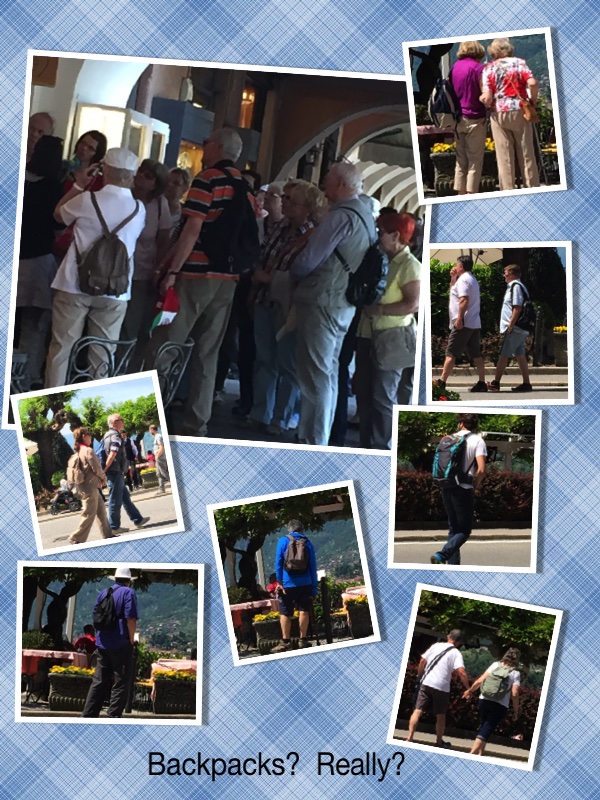 Bella Bellagio is besieged by tourists of all nationalities but it seems only the ones that speak English and maybe German carry backpacks.  Gaggles of them.  The charming village has narrow streets that wind up hill – both sides with shops designed to tempt the tourist.  That means the tourists are quickly stopping, turning to face the windows  and smacking me in the face.  Their backpacks that is smacked me in the face, head, shoulder etc.  I’m thinking you came to town on a tourist bus – are you carrying the crown jewels? Leave your stuff on the bus.