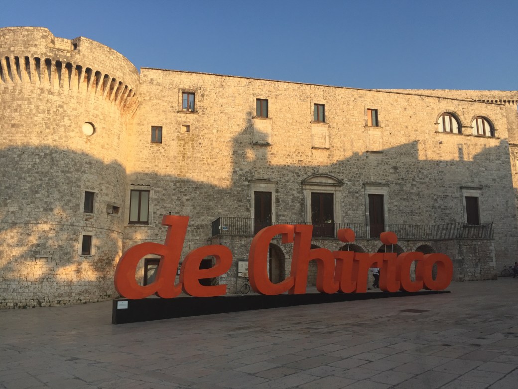 My hip isn’t always a happy hip. After a day of sightseeing in Bari, my hip was hurting. Our Pugliese pals, Salvatore and Rosanna, wanted us to see an art exhibit in the village of Conversano’s medieval castle. The artist – Giorgio de Chirico – is famous for “pittura metefisica”. Think Picasso. Suddenly, we found ourselves living in a metaphysical nightmare.