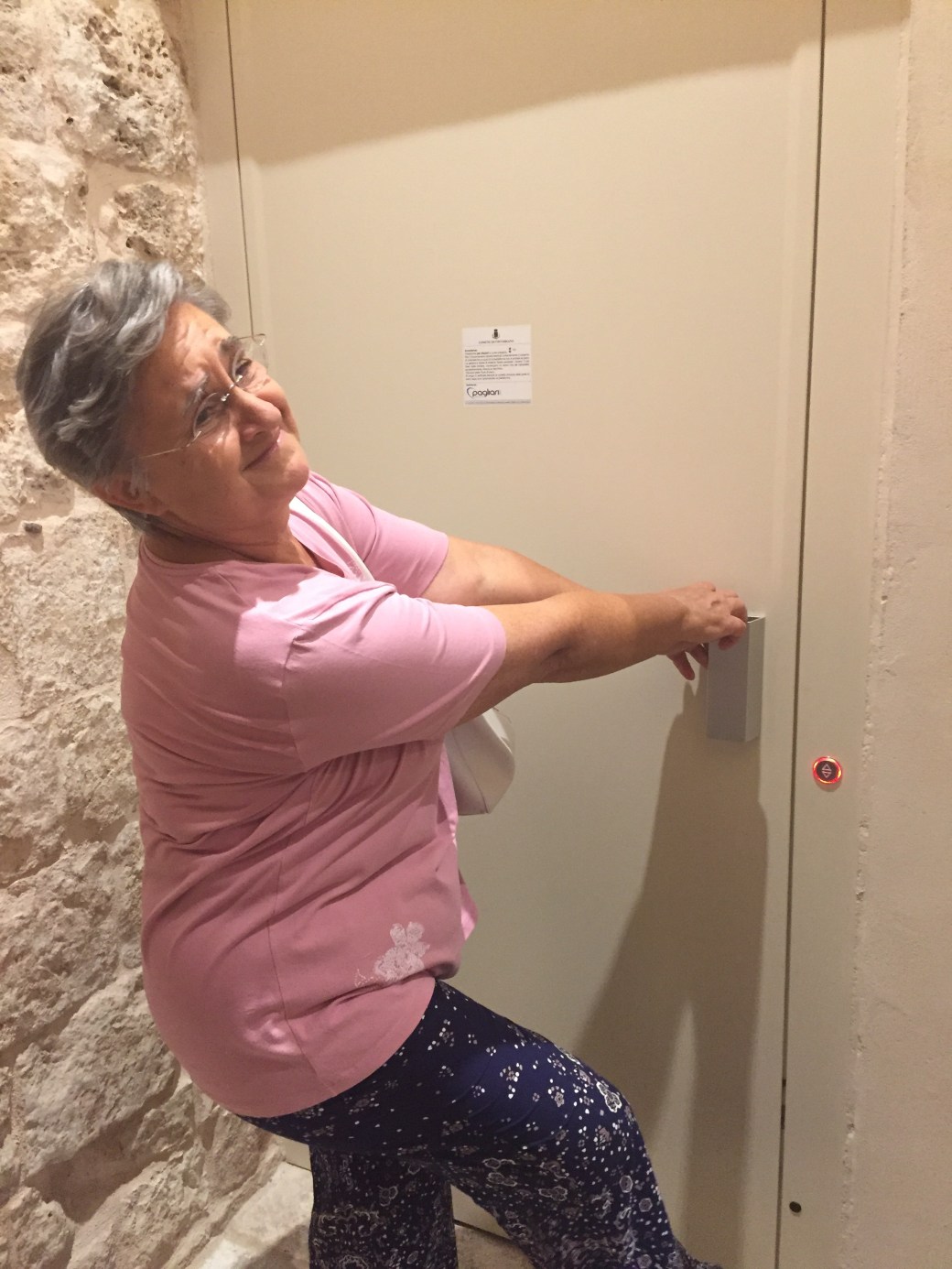 Salvatore entered the ancient stone structure, climbed the rock steps to the top and discovered the elevator for folks with disabilities. Actually, it looks more like a floating floor than an elevator. He bravely stood on the sheet of metal and rode it down to pick me up. Bump, click, groan and emergency bells started to bellow. Frankly, we heard bells and didn’t have a clue what they meant. We were in the courtyard waiting for Salvatore. Apparently, no one who worked at the castle knew what they meant either. No one came running. After about 15 minutes we all walked to the elevator and light bulbs started flashing in our brains!! Salvatore!!