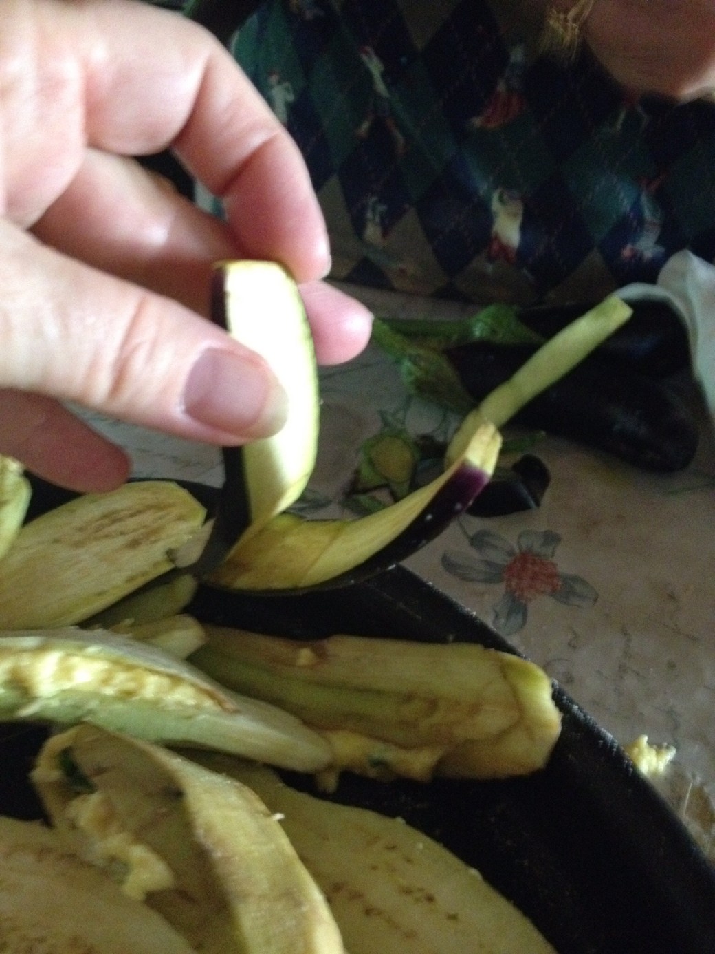 I like to eat the stuffed eggplant literally like a sandwich. She puts then in aluminum pans and covers them with what she calls sughetto and freezes them. They will be brought out in the winter, baked and eaten like – you guessed it – a vegetarian lasagna!