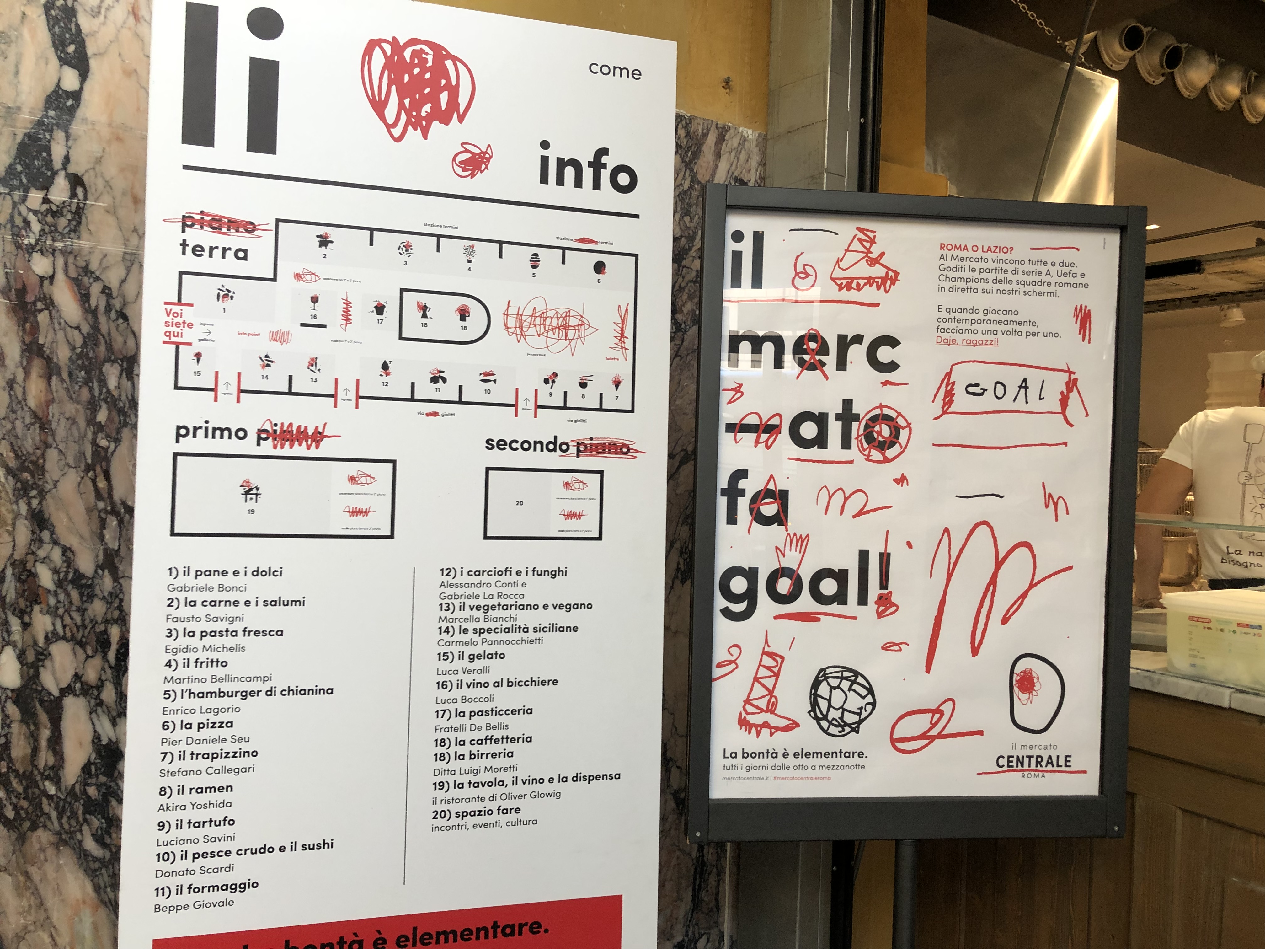 Actually, having to wade through cramped shops isn’t the most comfortable approach to Il Mercato. Leaving the station and walking outside around the block would have been easier. When we saw the funky sign, we knew we were in for a treat. Giggles bubbled up and we entered the hall.