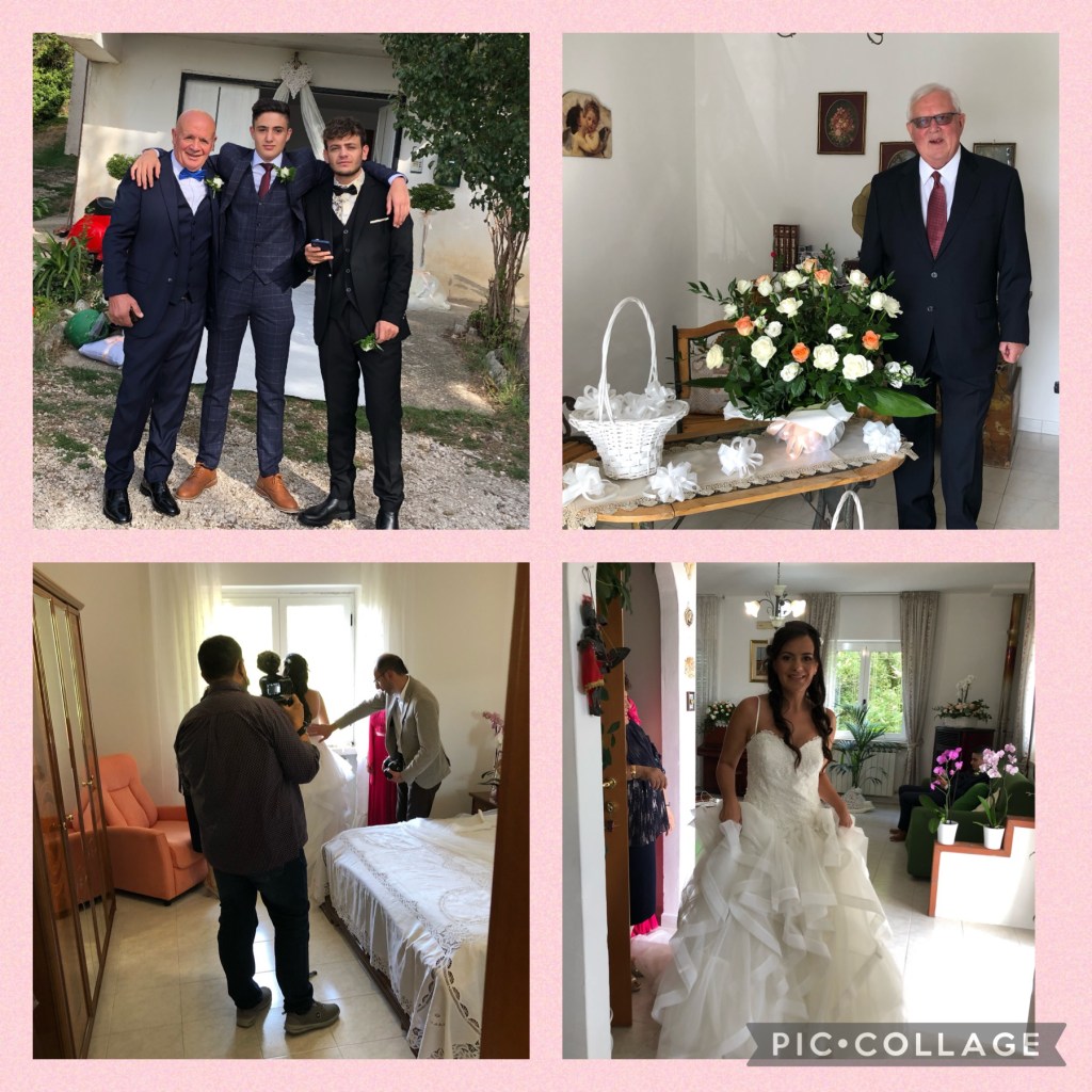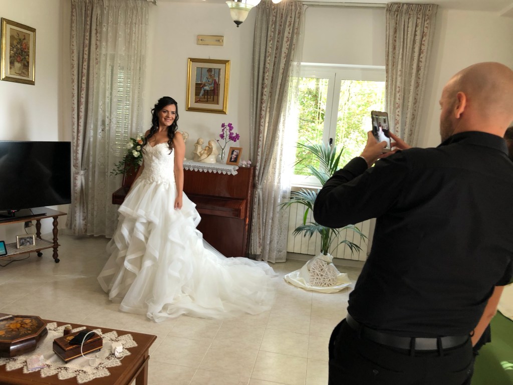 Wedding day was finally here. Hair dressers, make-up artists, videographers, photographers and Jack and I all paid a visit to Giusy and the Mancini family at home. This tradition of the extended family seeing the bride off from her home is very sweet. The house was festooned with flowers, tulle and camera boxes. Everyone was smiling and laughing as the video and photography team managed the show. Hmm, were we dress extras?