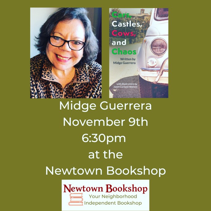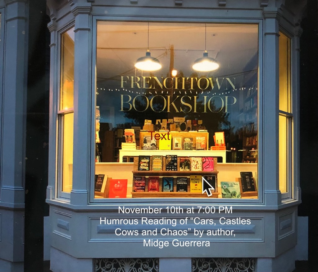 This week, I am taking my book of travel humor on the road! Come laugh with me. I’ll be reading stories from Cars, Castles, Cows and Chaos at the Newtown (PA) Bookshop, Frenchtown (NJ) Bookstore and at the Italian American organization UNICO District X! If you have a copy of my book, bring it along for me to sign. Also bring your questions about what life really is like for a type A New Jersey girl in a small Southern Italian village.