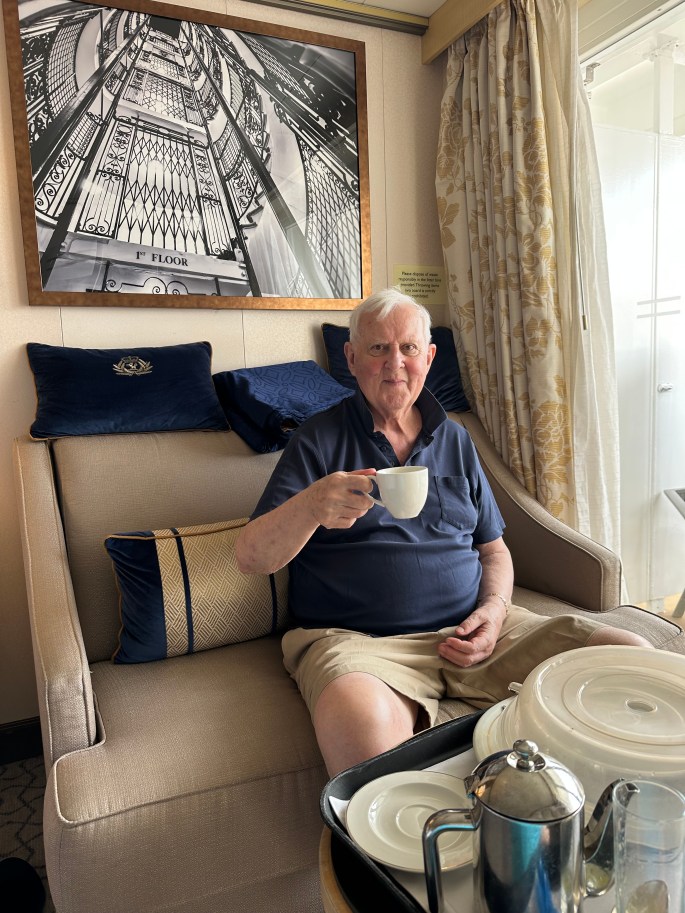 We had a room – or do I call it a cabin – that was quite large, had a sitting area, ensuite bathroom with a large shower and an obstructed view terrace. We could sit outside and see the sea through the glass sides of a lifeboat. Not being athletic, I didn’t think that if the need arose I could sprint and leap into the lifeboat. The obstructed view cost less and since we were rarely there was inconsequential.