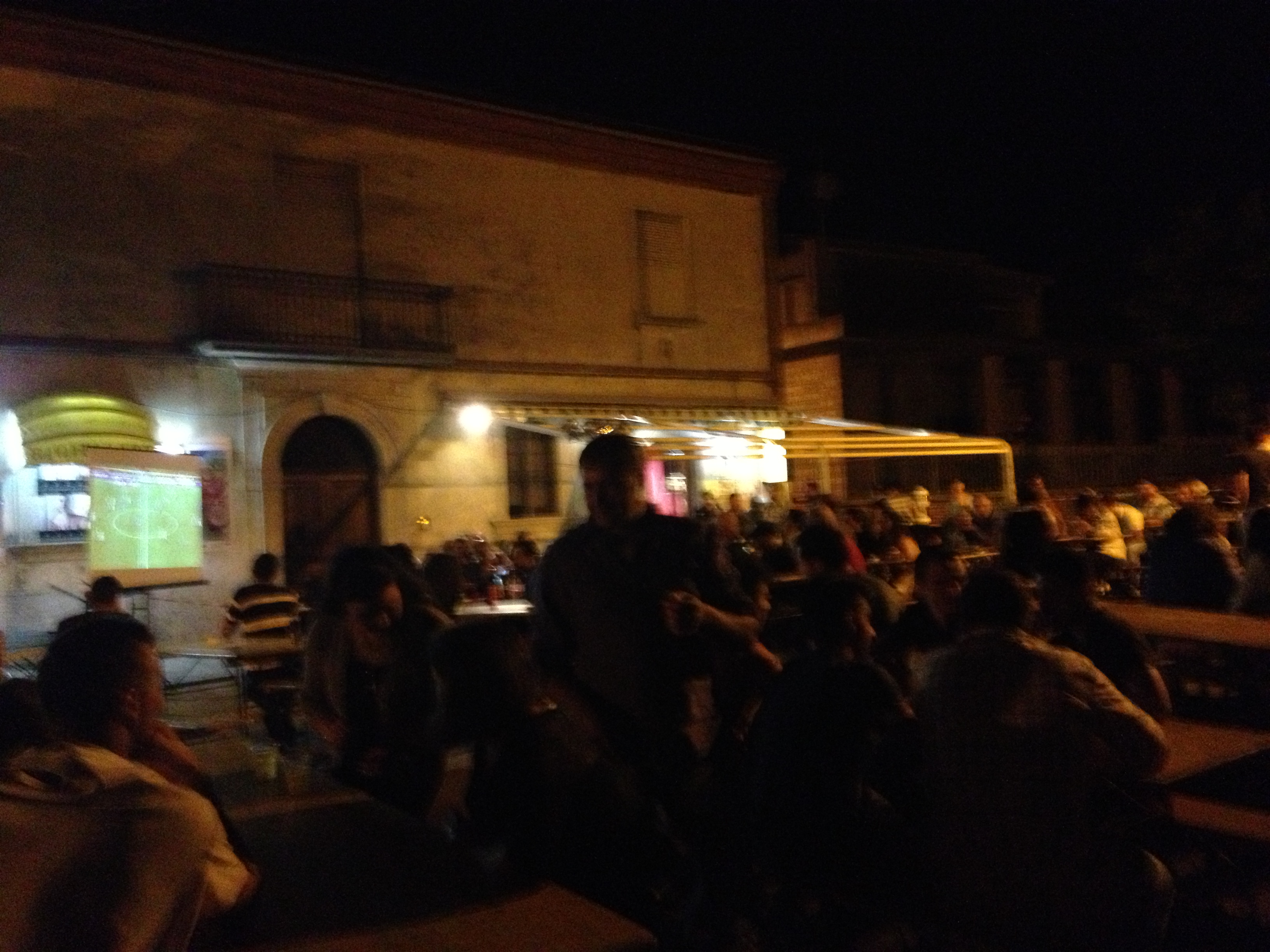 We rounded the corner and could see a movie screen set up in front of Bar 2000. The street was closed off, picnic tables filled the street and about a hundred people were gathered watching a calcio match of Italy versus Brazil.