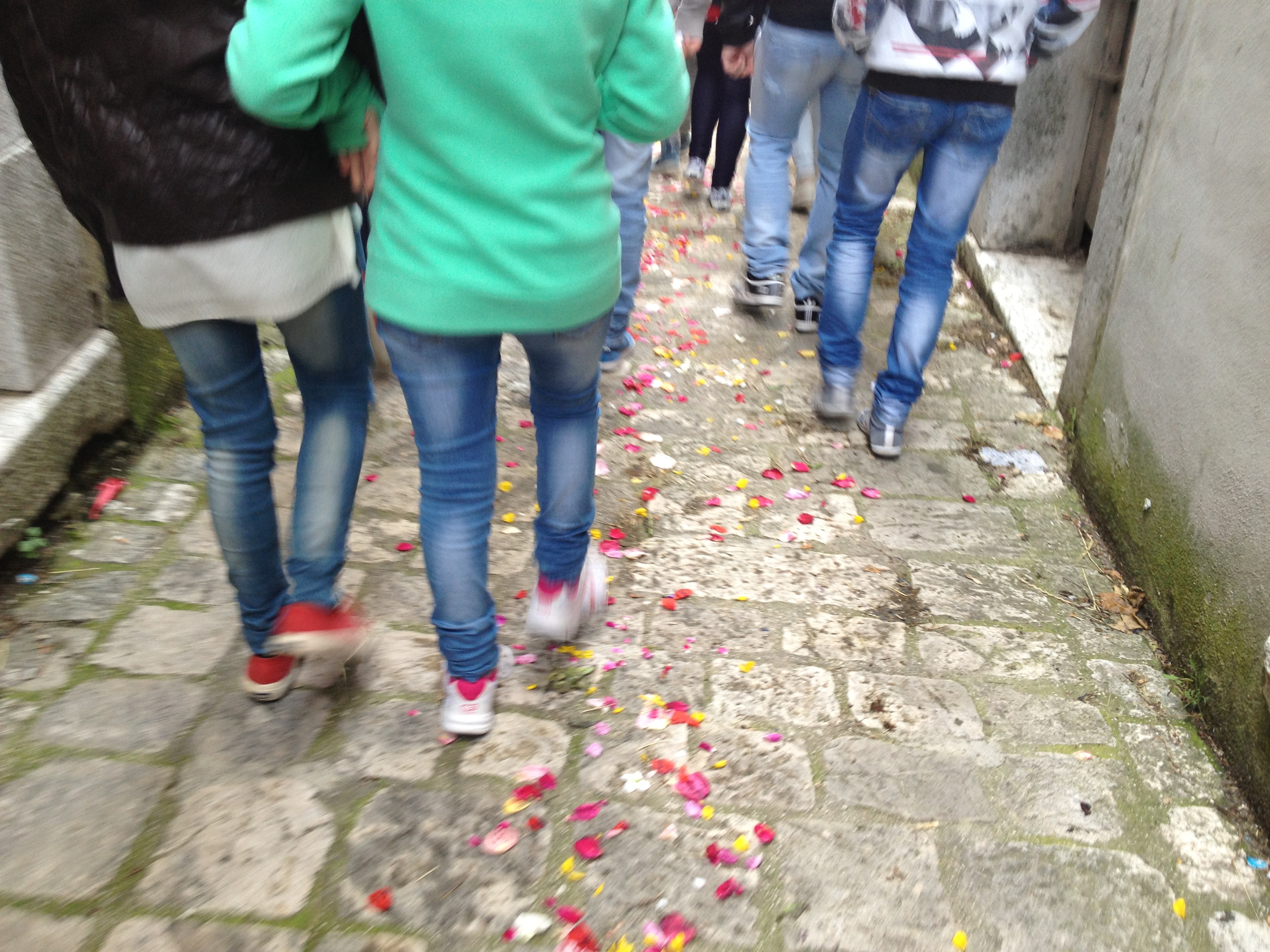 3. All of the children who last week celebrated their first communion were leading the procession. The boys were tossing rose petals and the girls were sporting flower crowns and looked like the promised vestal virgins. Since this event celebrates communion it makes sense that the children were involved – but how come the tossed flower petals????