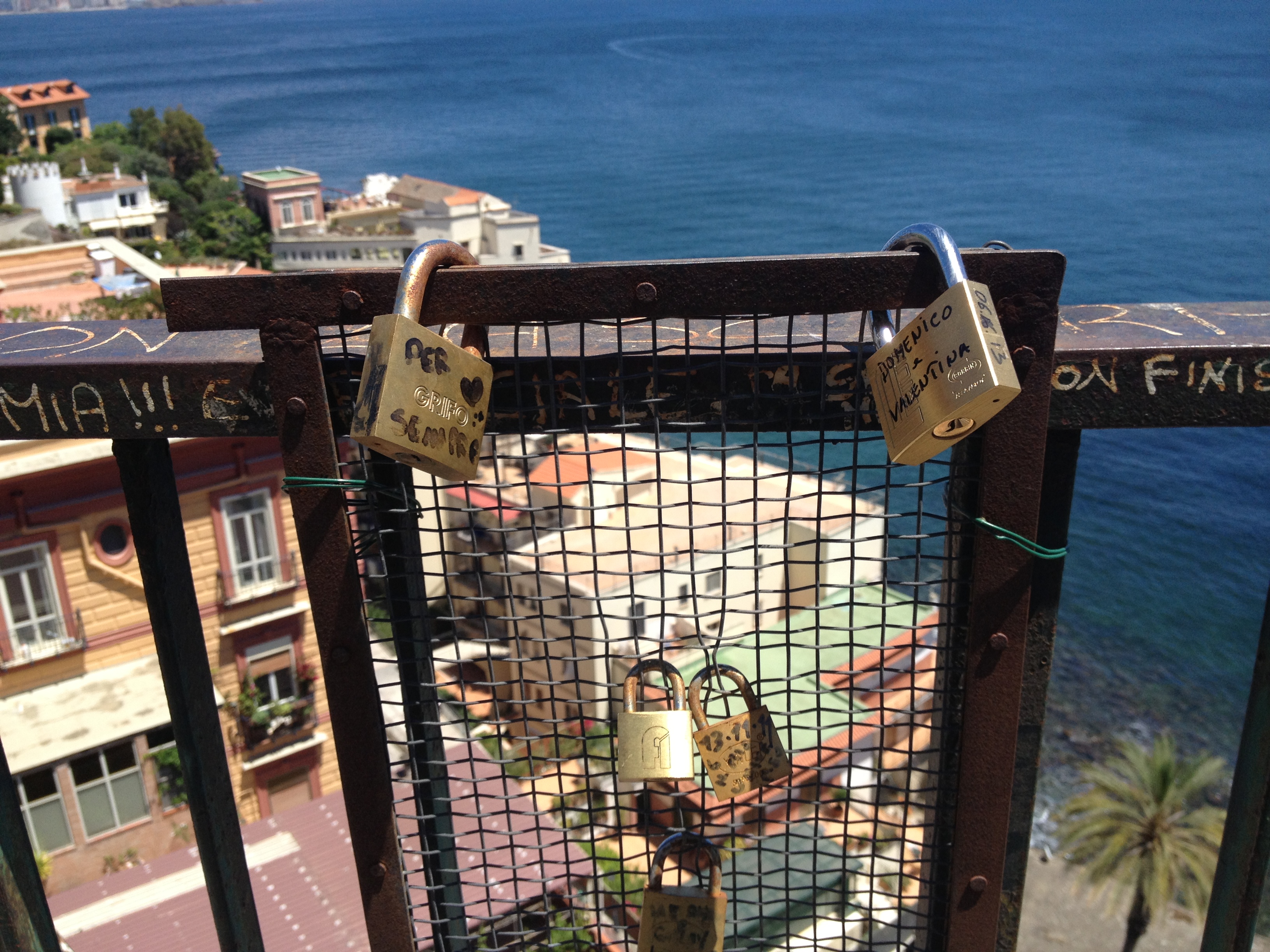 Want to buy me this house in Posillipo?We first saw these “lovers locks” in Paris a few decades ago. Young love….Now this is a roof top terrace!