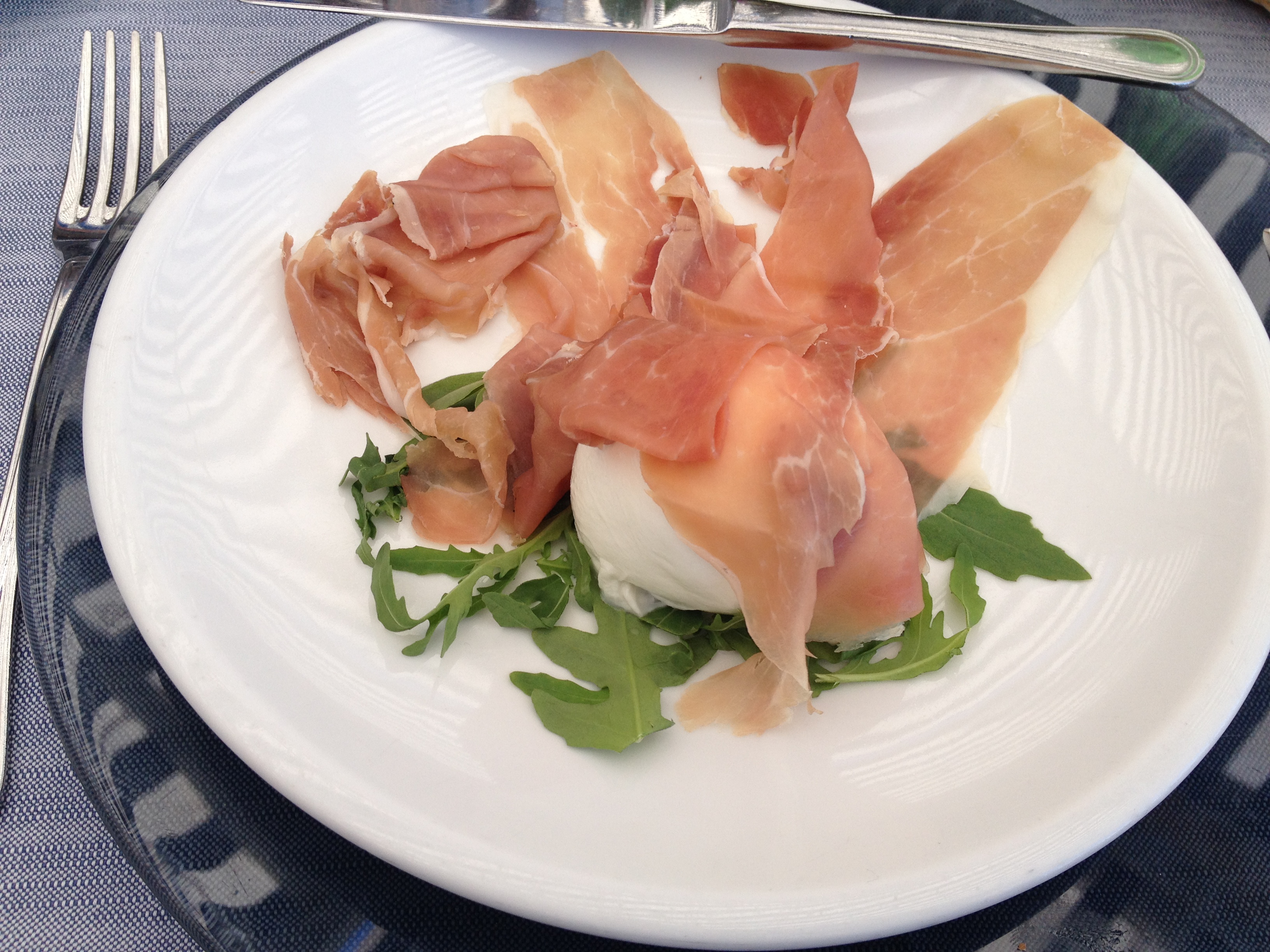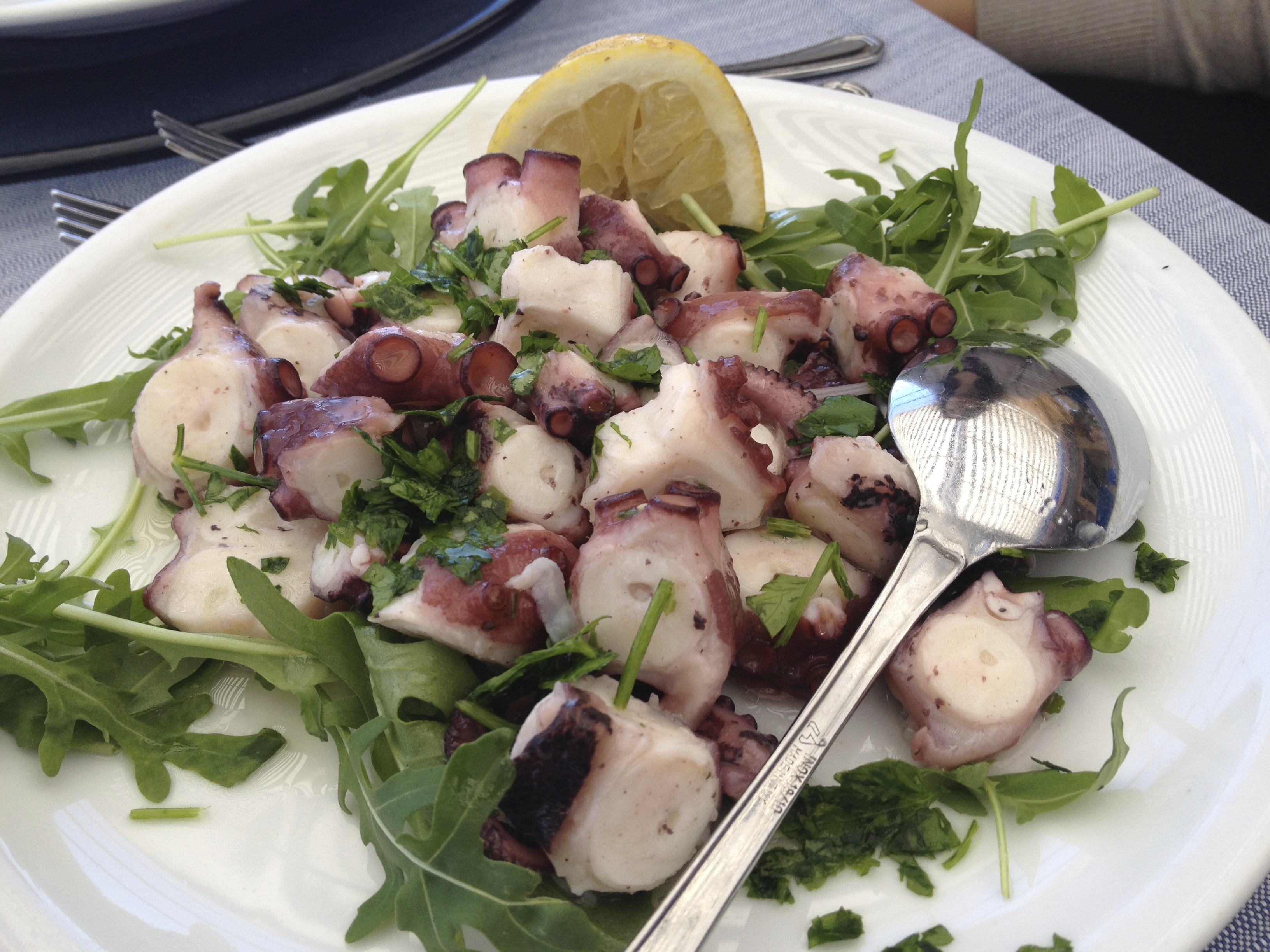 Octopus tossed with lemon on a bed of arugula.Need protein? Buffalo mozzarella hidden under prosciutto.I took the mussels and clams out of their shells and then remembered to take a picture. Hey, It smelled like I should dig right in.
