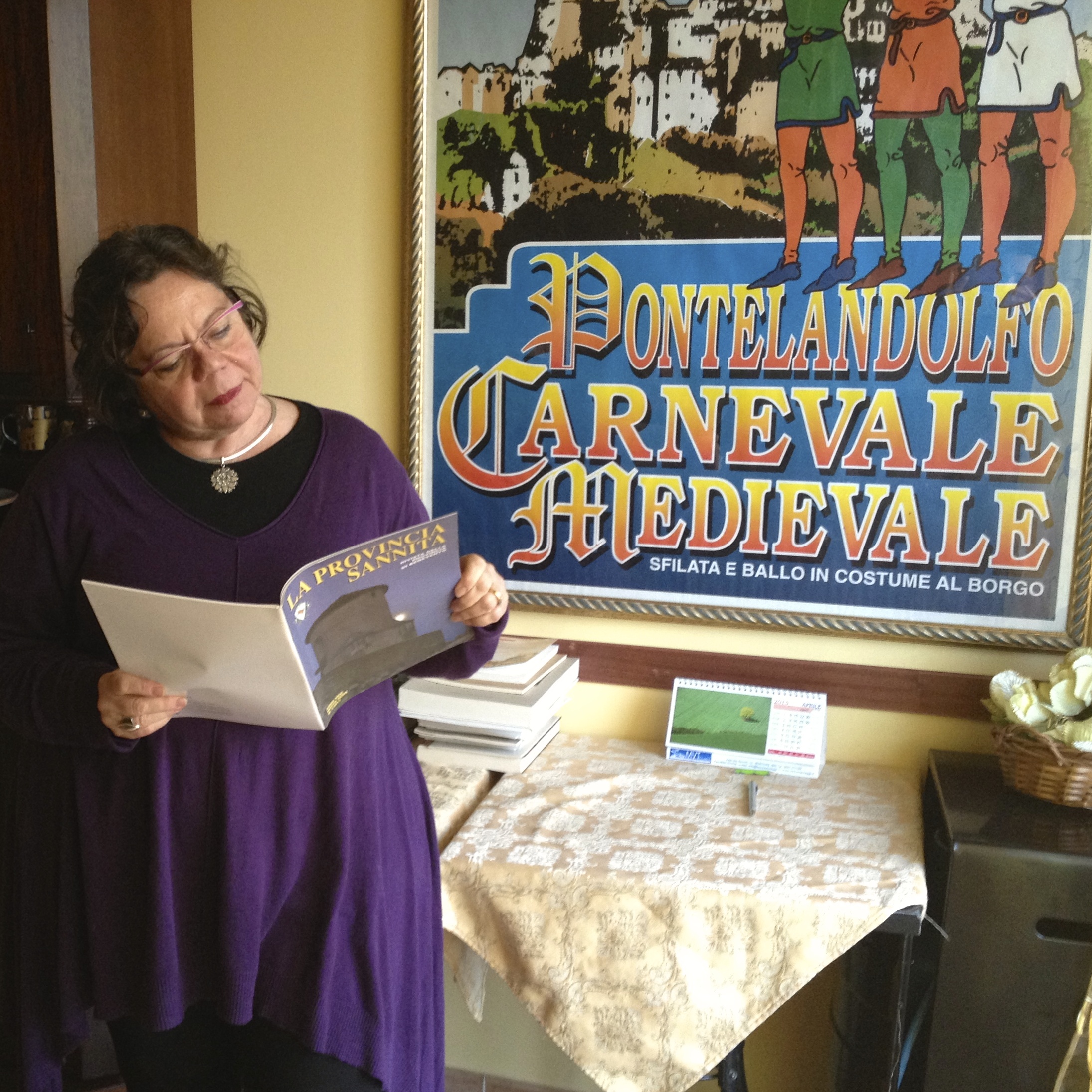 Looking like something the proverbial cat dragged in, I said hi to folks I knew and dropped into a seat. Wow, I thought, the glitterati is out tonight. Not only was the audience well dressed, they all had come early – that must mean something “hot” is happening tonight. The performance space looked incredible – from the comfortable overstuffed turquise couch and coffee table on the stage, to the display of art photos by the incredible Salvatore Griffini, to the piano and guitarist primed to play – the tone was set for an interesting evening. Taking a breath and hoping no one sat too close to me, I was hit in the head with the boing boing of an epiphany. This very second, we could be anywhere the arts flourish – in a swank artsy neighborhood in Brooklyn or Downtown Manhattan or Chicago or Austin – BUT WE WEREN’T. We were in a tiny little southern Italian village – Pontelandolfo. A place where the young and the old make art.