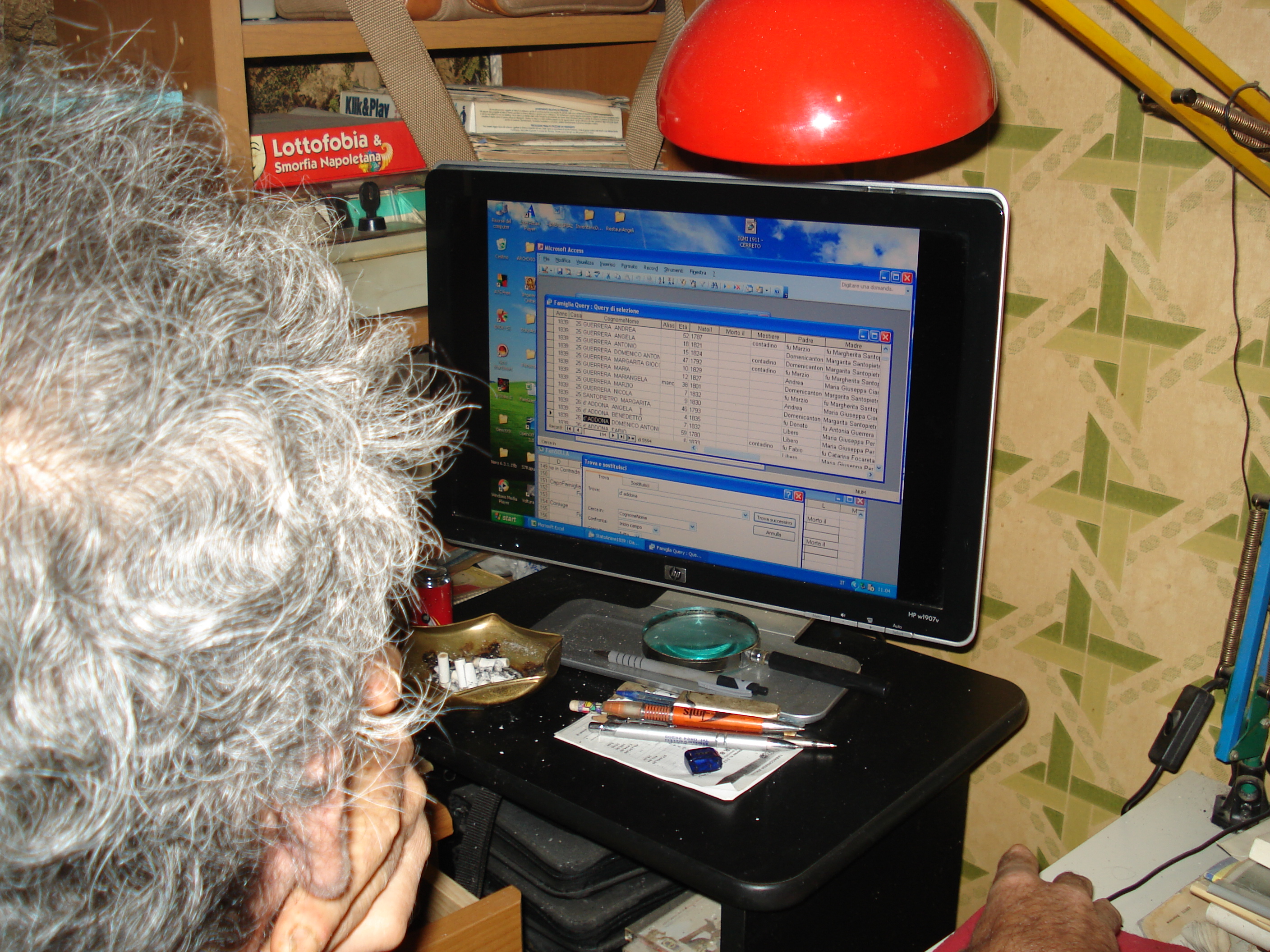 The shutter of the second floor window burst open and our guide into the past thrust out his sleepy head. “Beh?” Oops, were we too early? Annarita explained that we had an appointment to see the church archives. While he was mulling that over, the beaded curtain in front of the door parted and a middle aged woman peeked out. Shouts from above moved her. She ushered us into the front room. More shouts from above and she ushered us up the stairs. Annarita and I looked at each other. Weren’t we supposed to go to the church? Wasn’t he the dude with the archive room key? Why are we going up to – well who knows what? What had my quest for the family’s history gotten us into? That quest had led us to the true keeper of the keys to knowledge – Antimo Albini! After a cursory greeting, Antimo promptly sat down at the computer, lit a cigarette and led me on a four hour journey into my grandmother’s past.